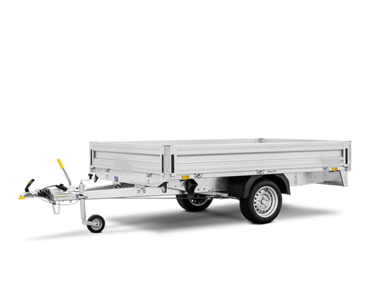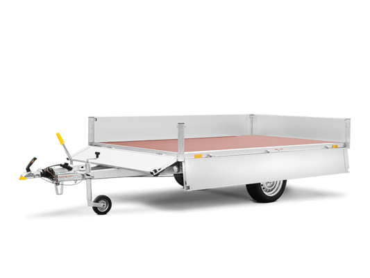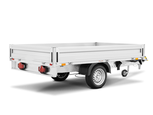 Prático e bem concebido: com as laterais rebatidas, o reboque alto HN é muito fácil de transportar com um empilhador, e a sua baixa altura de carga facilita o manuseamento. Os anéis de amarração dos nossos reboques suportam uma força de tração de 400 kg, permitindo o transporte de cargas muito pesadas em segurança (certificação DEKRA).